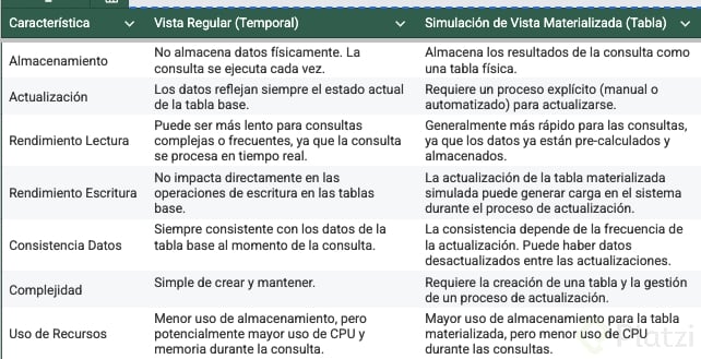 - Reducción en el tiempo de ejecución: Al almacenar los resultados ya calculados de consultas complejas, las vistas materializadas liberan recursos al evitar el recalculo en cada ejecución.