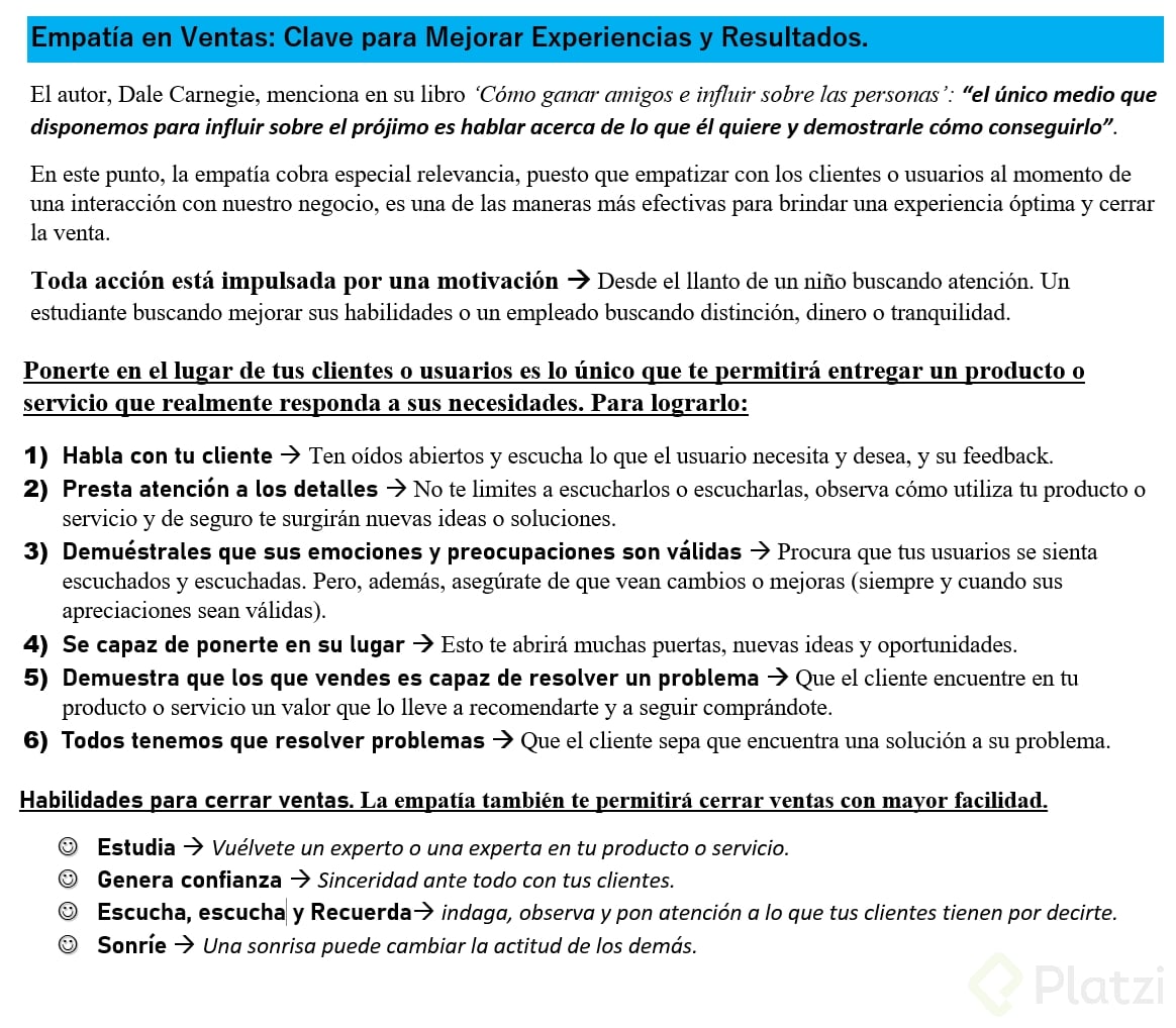 Como bien mencionó el autor estadounidense, Dale Carnegie, en su libro 'Cómo ganar amigos e influir sobre las personas': "el único medio que disponemos para influir sobre el prójimo es hablar acerca de lo que él quiere y demostrarle cómo conseguirlo". En este punto, la empatía cobra especial relevancia, puesto que empatizar con los clientes o usuarios al momento de una interacción con nuestro negocio, es una de las maneras más efectivas para brindar una experiencia óptima y cerrar la venta.