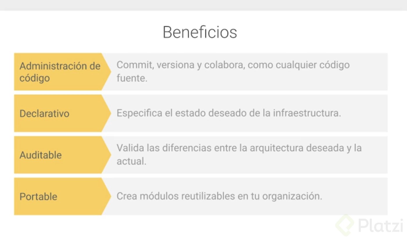 - Declaratividad: Puedes definir, a través de un archivo, cómo deseas que sea tu infraestructura. Esto asegura que siempre obtendrás lo que necesitas en términos de recursos y comportamiento.