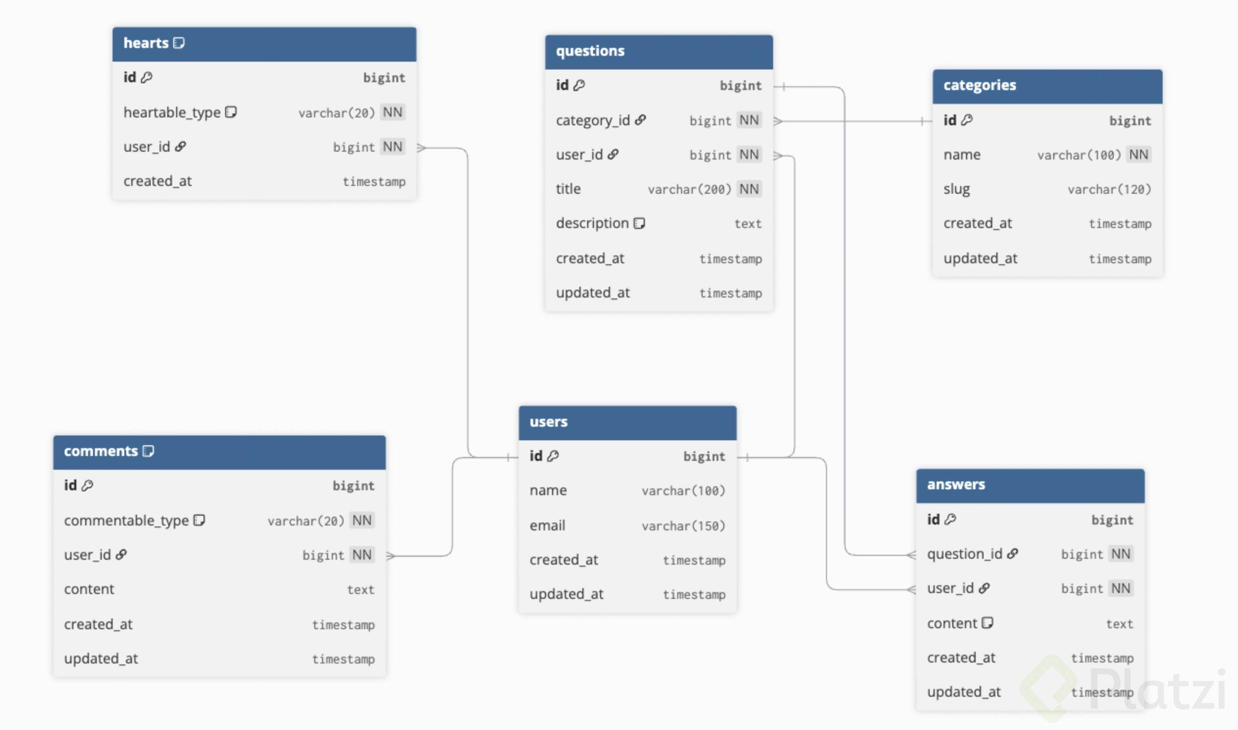 - Pertenece a un usuario: preguntas y respuestas se conectan mediante esta relación indicando qué usuario las creó.