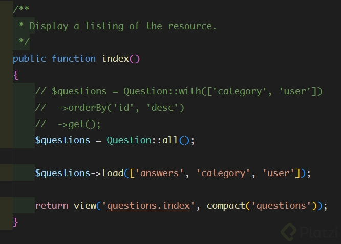 Esto quiere decir que Laravel hace una búsqueda del registro automáticamente con el ID provisto en la ruta. Además, con el método load añades dinámicamente más relaciones a la consulta existente.
