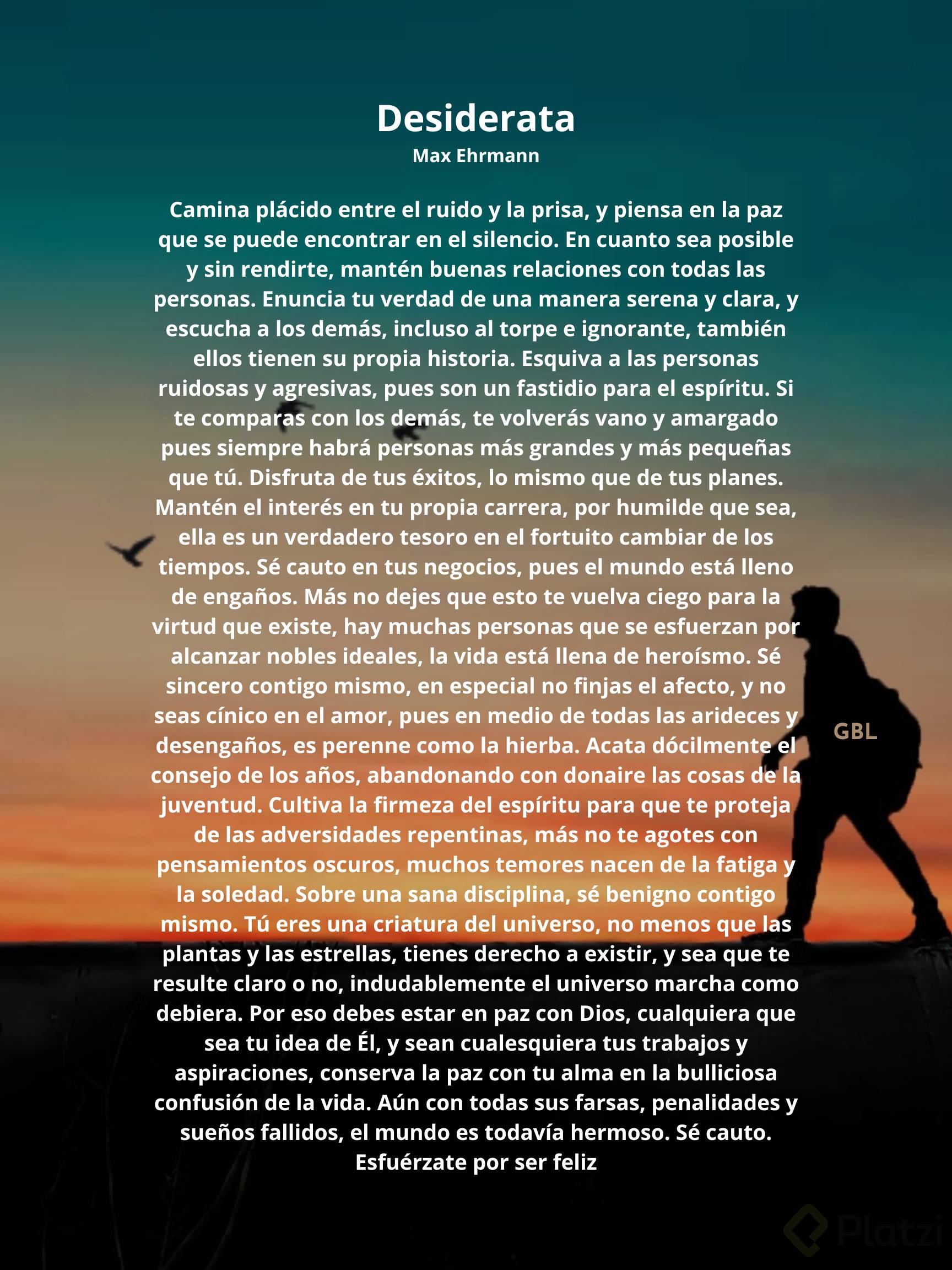 Leé el poema Desiderata y contá en los comentarios cómo te impactó y qué parte quieres aplicar hoy en tu vida.