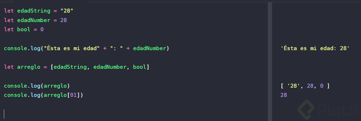 let arreglo = ['texto', 29, true]; // Arreglo con diferentes tipos de datos.