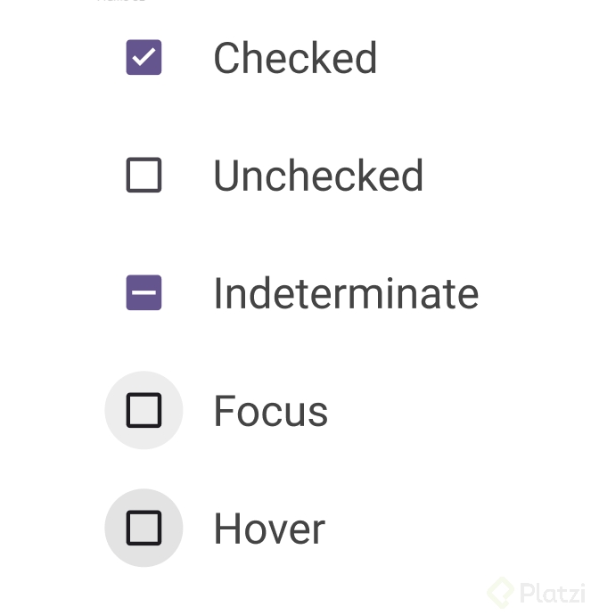Incluyendo los estados accionables de Checked, unchecked, y los estados visuales, que nos ayudan a darle feedback al usuario: