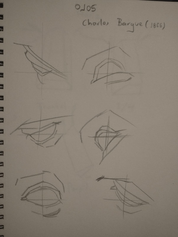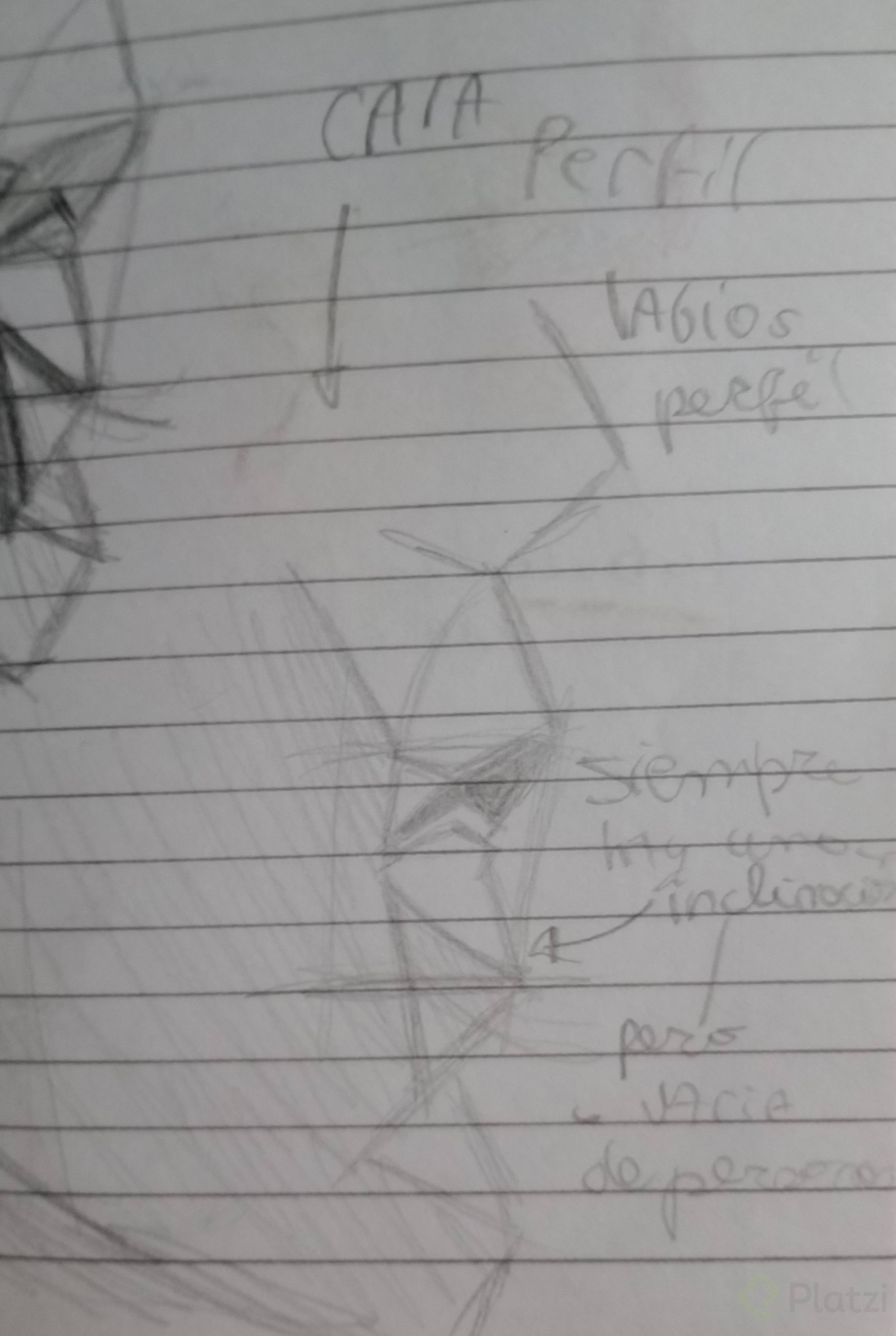 Inclinación y perspectiva: Observando los labios desde un perfil se aprecia una inclinación característica; rara vez son verticales. Importante es analizar este ángulo, y cómo los labios se acomodan en un pequeño cuadro incluyendo la parte visible de la esfera antes de dar paso a los planos laterales de la cabeza.