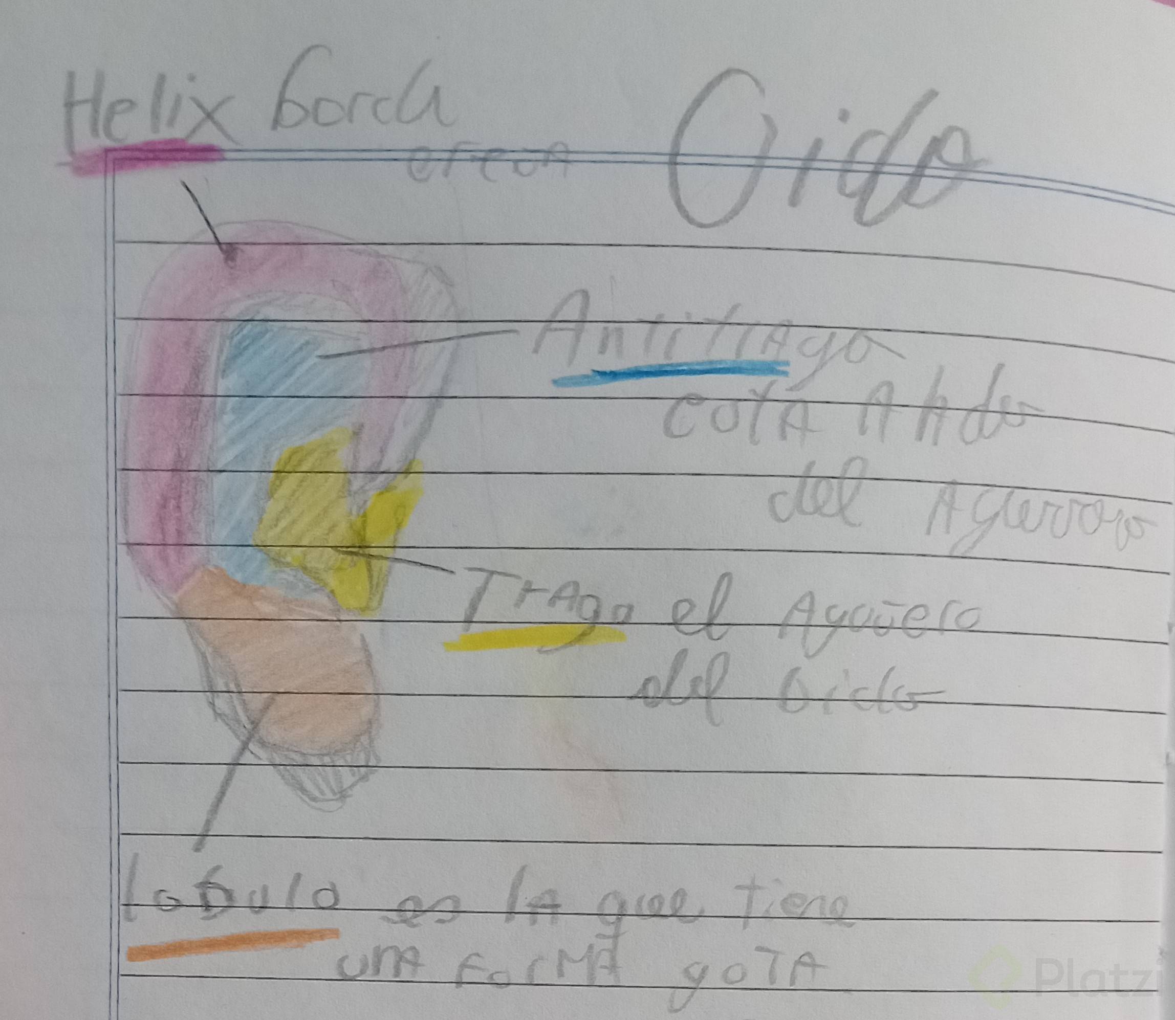 Partes esenciales: Diferentes colores en un diagrama ayudan a identificar partes clave como el helix (una forma tipo espiral), el óvulo (parte inferior) y el antihelix (forma en V o Y). Otro componente es el trago, formando un canal auditivo.