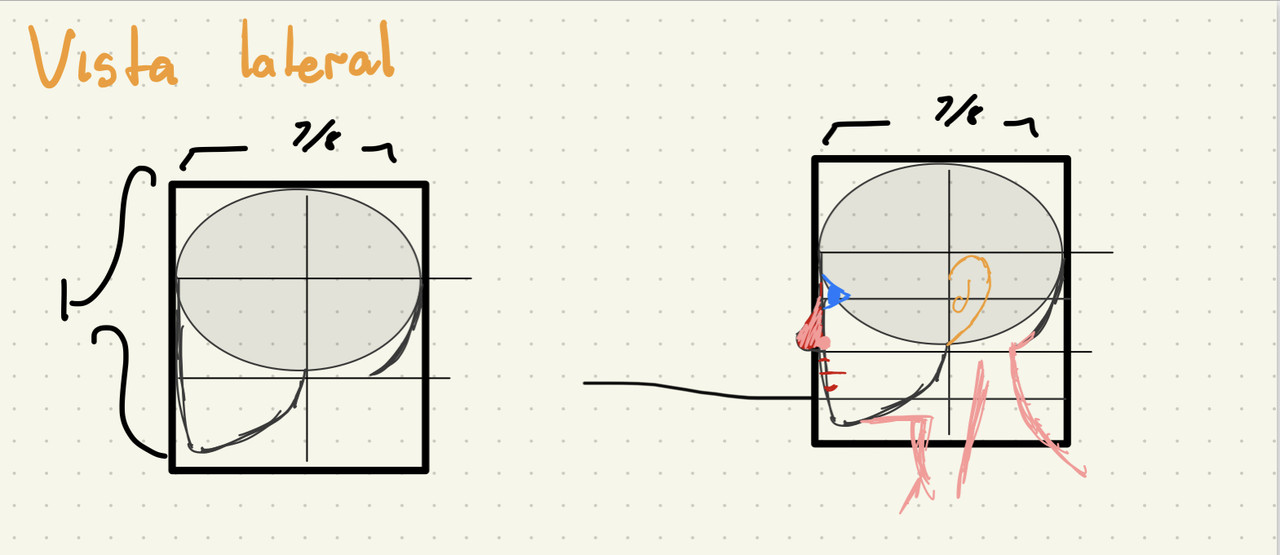 La vista lateral del rostro requiere una observación meticulosa y un abordaje diferente al de la vista frontal. Aquí, el enfoque inicia con la creación de una figura casi cuadrada, de proporción 1 altura por 7/8 de ancho, también dividida en tres tercios.