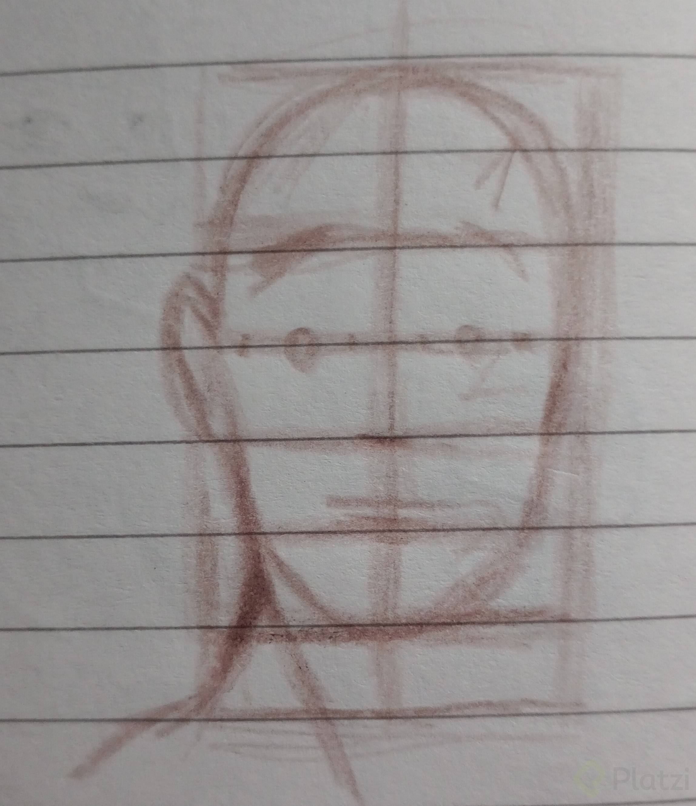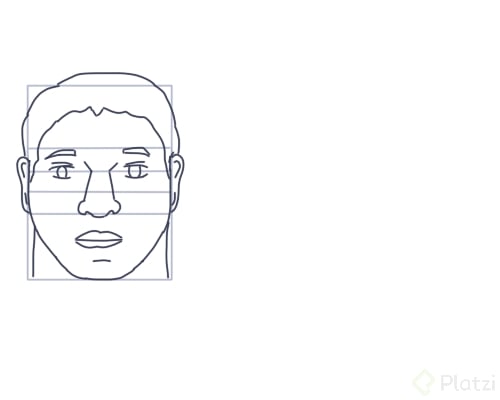 Para estudiar el rostro desde una vista frontal, inicia dibujando un rectángulo. Este rectángulo, con una altura de 1 y un ancho de 2/3, se dividirá en tres partes iguales verticalmente. Luego, divide el eje vertical a la mitad para ubicar la forma del rostro, que se asemeja a un huevo invertido.