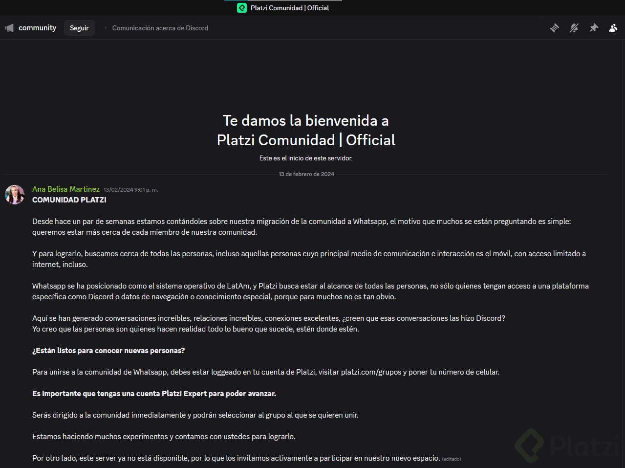 Union al servidor de Platzi puede ser el primer gran paso para integrarte en comunidades específicas. Sigue estos pasos: