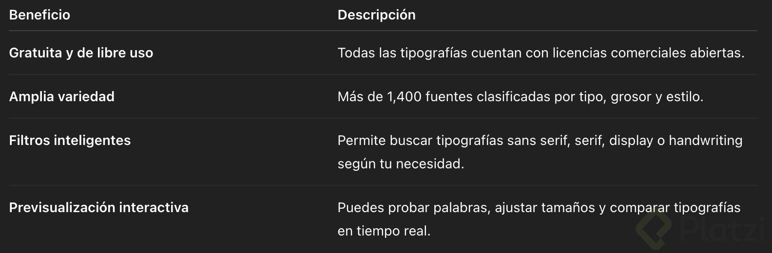 Existen diversas plataformas para encontrar tipografías libres, pero Google Fonts es una opción destacada por su estándar de uso y amplia variedad de fuentes.