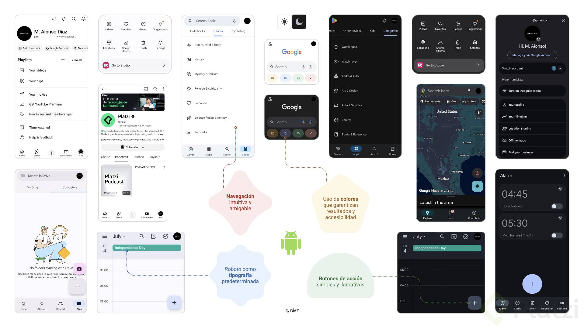 Material Design establece criterios visuales claros para aplicaciones Android, buscando una experiencia de usuario consistente en todos los productos de Google como YouTube y Google Maps. A diferencia del minimalismo propio de Apple, Google permite flexibilidad y personalización en sus diseños. Esta filosofía equilibra estructura y creatividad, adaptándose a variadas resoluciones, fabricantes y tipos de dispositivos Android.