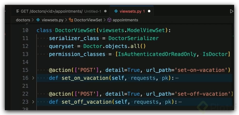 Para implementar la acción, es necesario definir un método en el viewset del doctor, que maneje tanto GET como POST. El objetivo principal del POST es recibir los datos de la cita que desea agendar el usuario y crearla utilizando un Serializer. Aquí, el ID del doctor se obtiene de la URL, asegurando que no se pueda modificar desde el formulario.