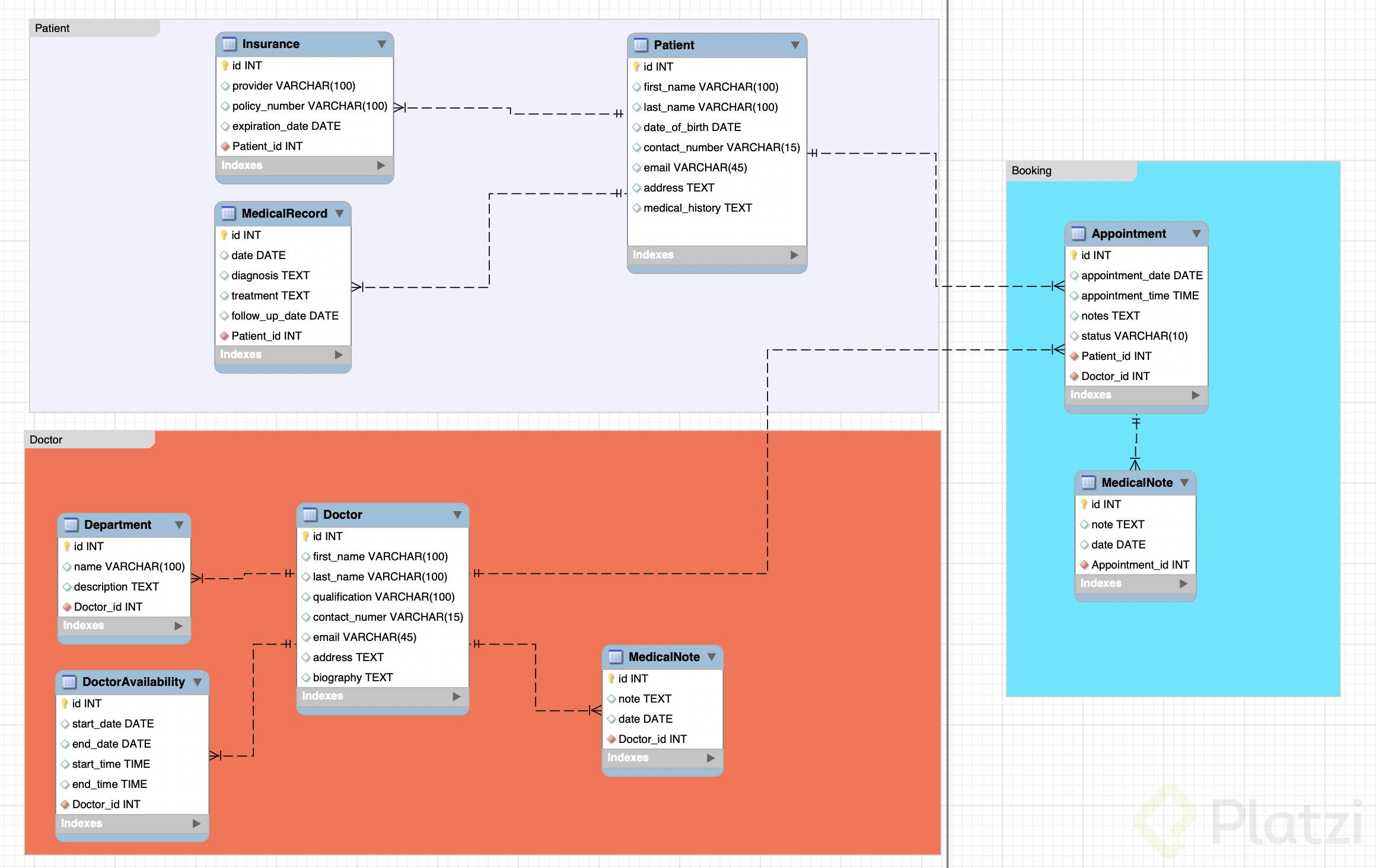 - La tabla Appointment conecta pacientes y doctores, registrando las citas agendadas y las notas médicas asociadas.
