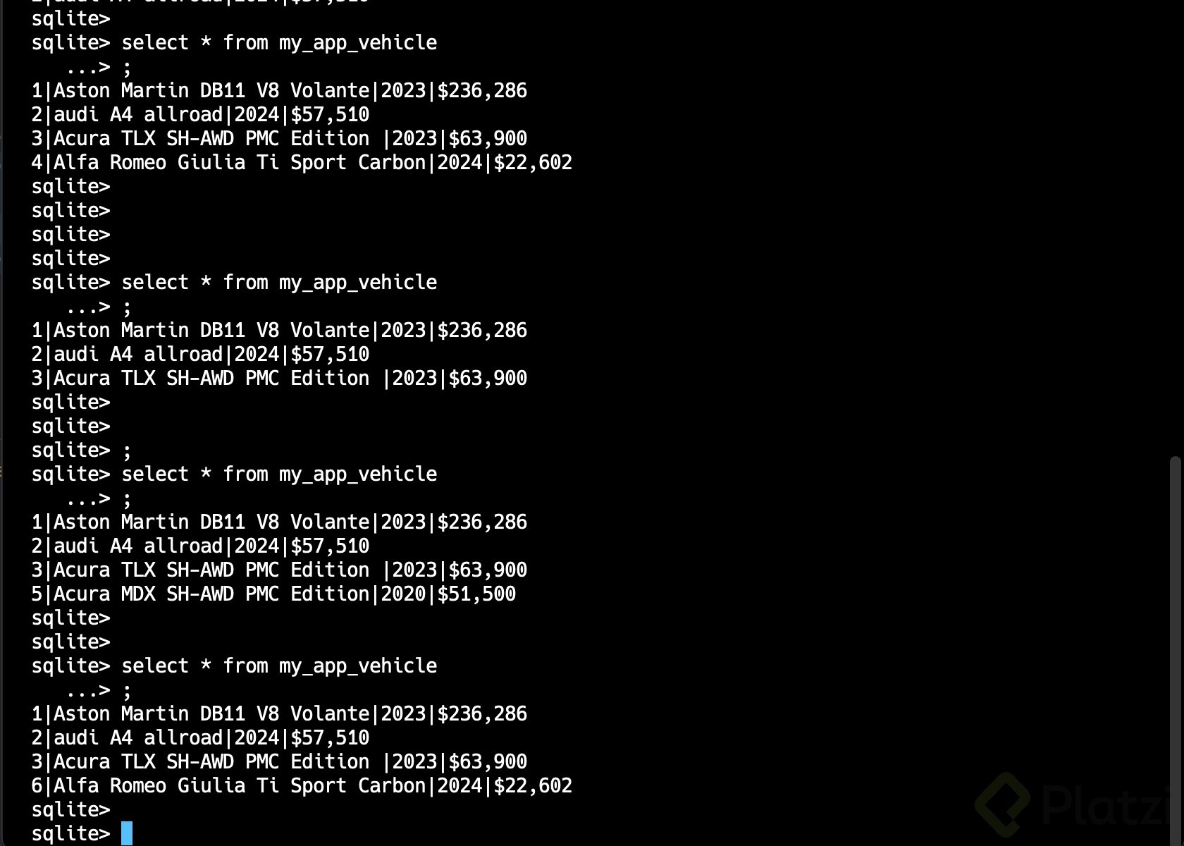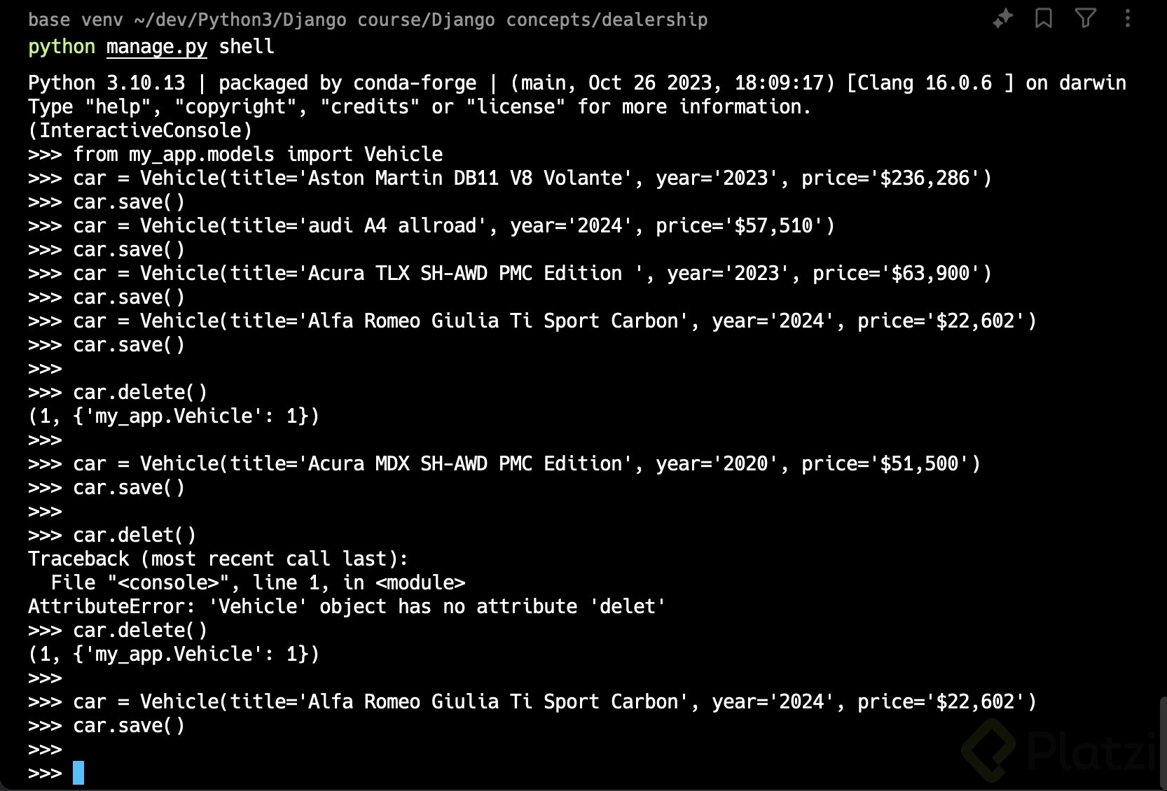 Carcon el título "Jeep":other_car = Car(title="Jeep") other_car.save()Tras su creación, puedes ver este nuevo objeto también reflejado con un comando