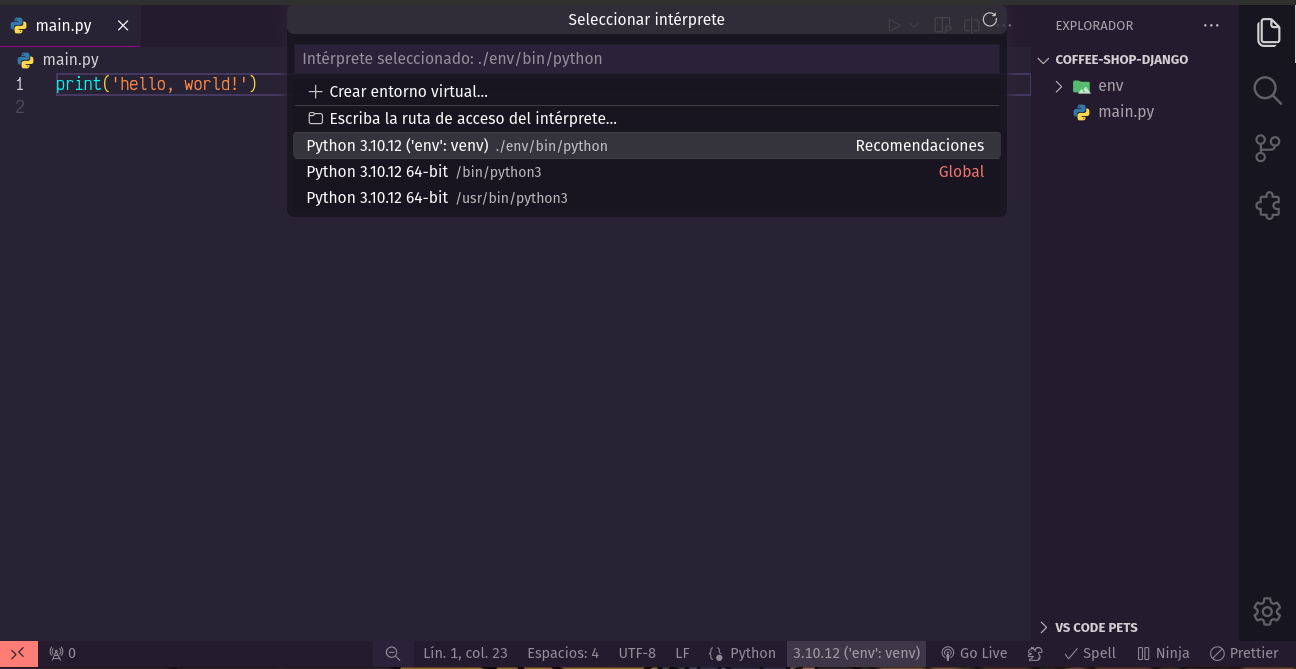Para iniciar, nos posicionamos en la carpeta deseada en nuestro editor. Creamos el entorno virtual con: