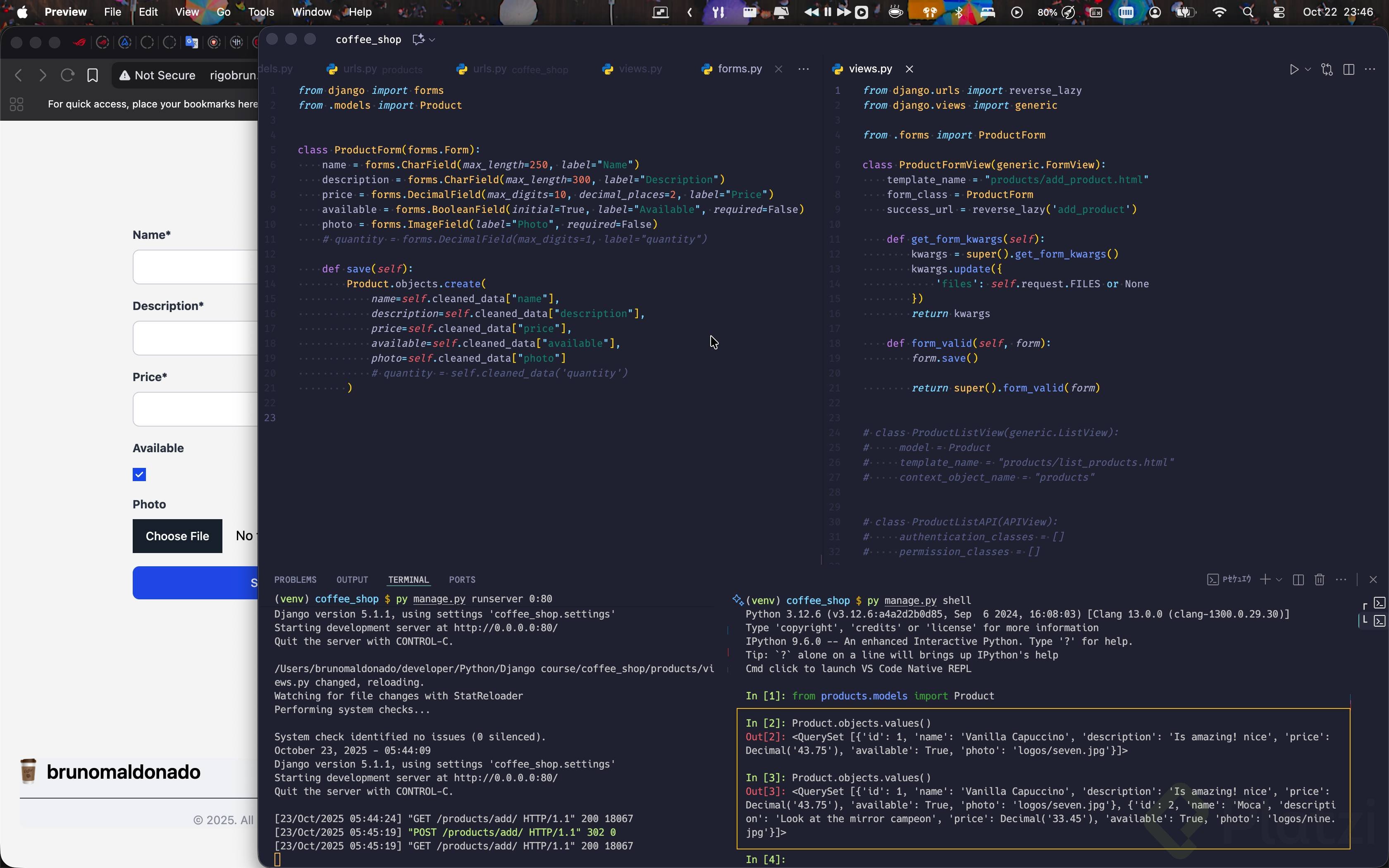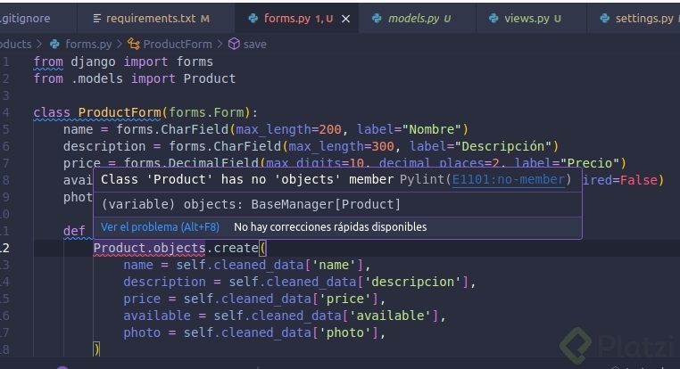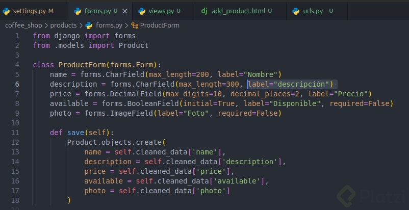 def save(self): from .models import Product data = self.cleaned_data Product.objects.create( name=data['name'], description=data['description'], price=data['price'], available=data['available'], photo=data['photo'] )