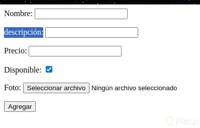 <h1>Agregar Producto</h1> <form method="post" enctype="multipart/form-data"> {% csrf_token %} {{ form.as_p }} <button type="submit">Agregar</button> </form>