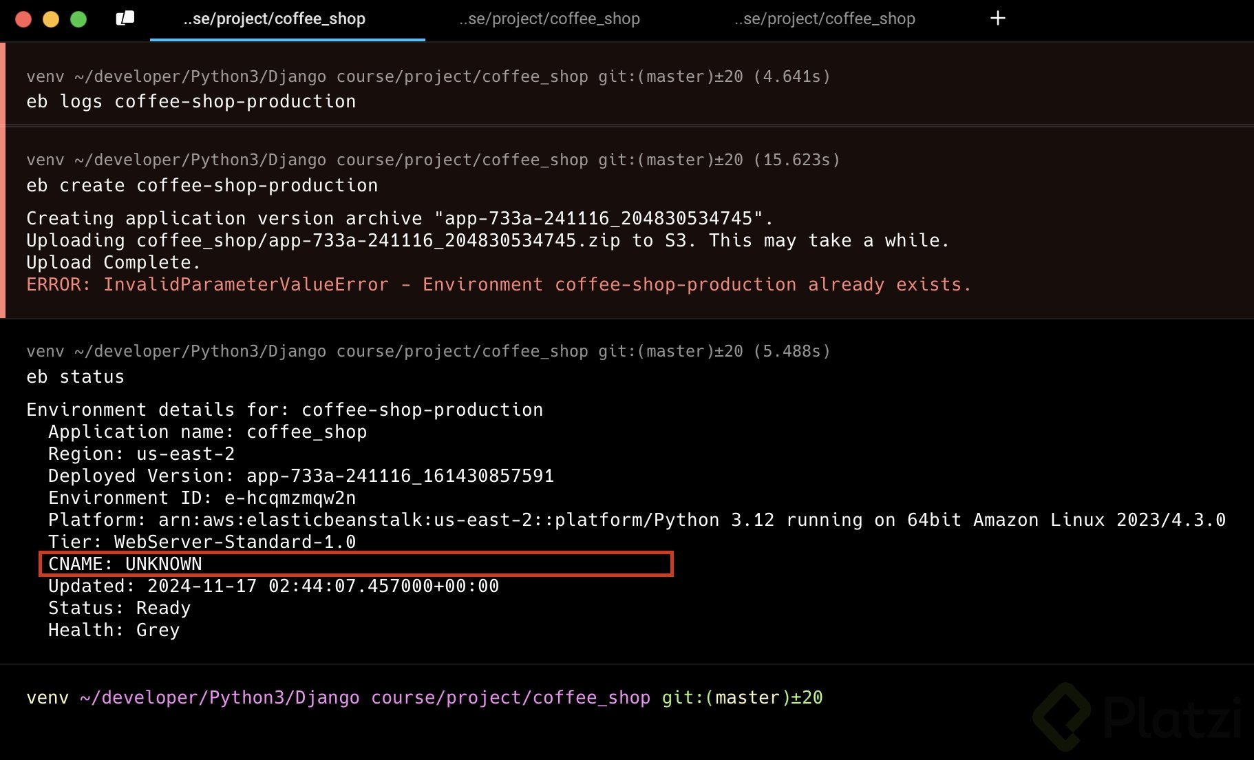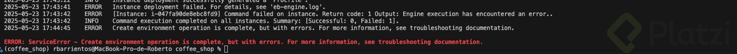 eb create coffee-shop-production. - El servicio creará la infraestructura necesaria, incluyendo instancias y configuraciones de seguridad.