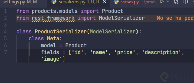 ModelSerializerdesderest_framework:from rest_framework import serializers from .models import Product class ProductSerializer(serializers.ModelSerializer): class Meta: model = Product fields = '__all__'