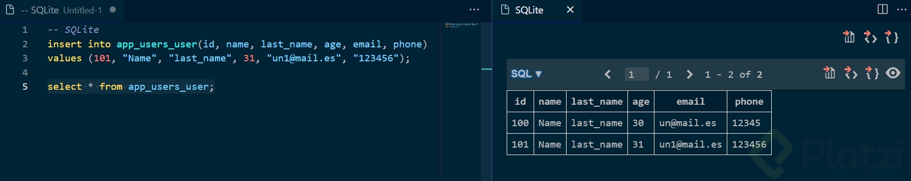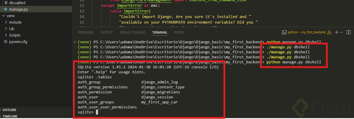 Puedes revisar la base de datos usando python manage.py dbshell. Este comando te conecta a la base de datos definida en el archivo settings.py. En este caso, se utilizó SQLite, que es fácil de usar pero no ideal para producción debido a su baja concurrencia.