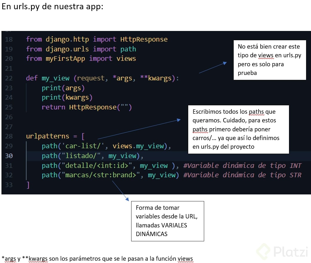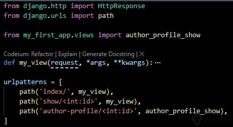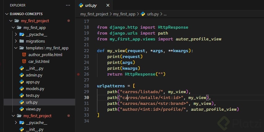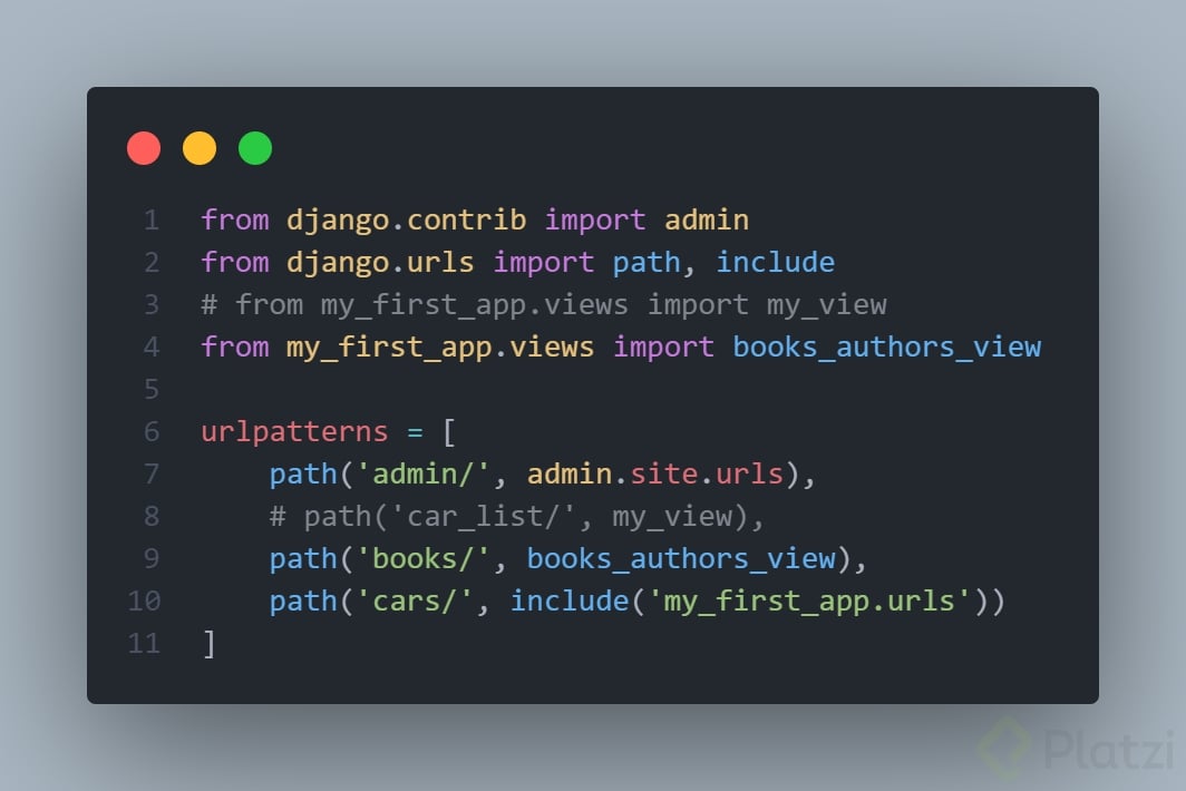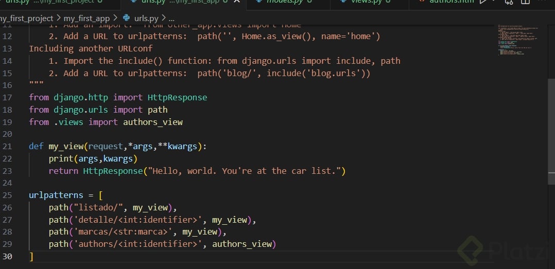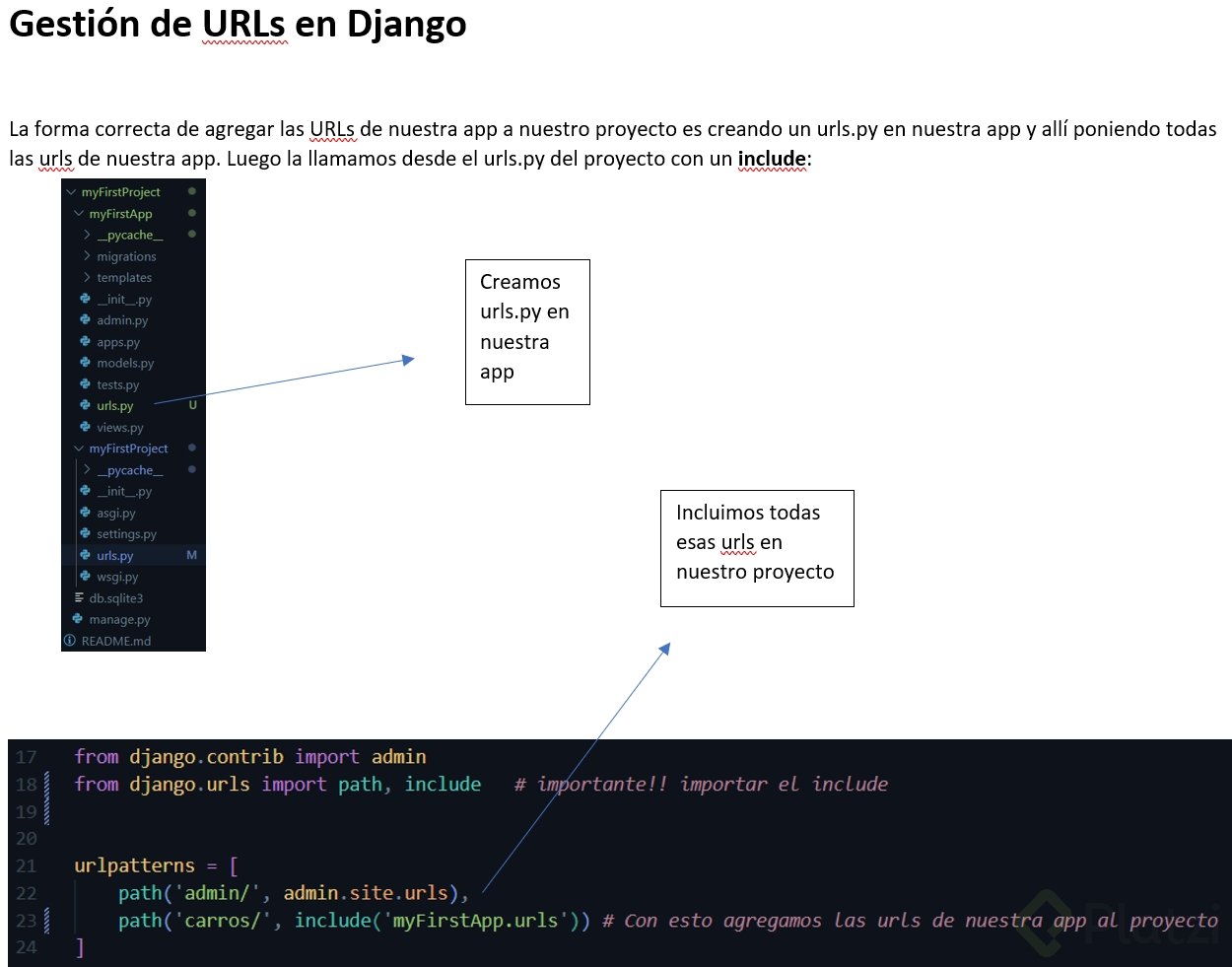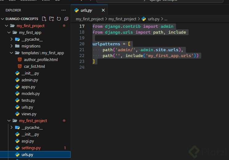 MyFirstApp, crea un archivo llamadourls.py. - Copiar y pegar configuración básica: Puedes copiar la configuración básica de otro archivo de URLs y modificarla según sea necesario.