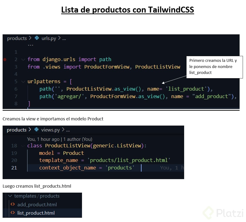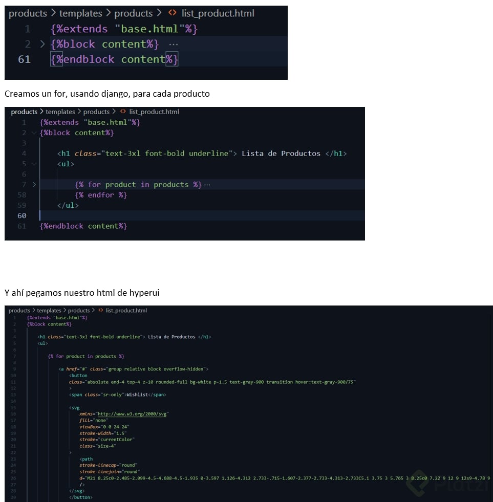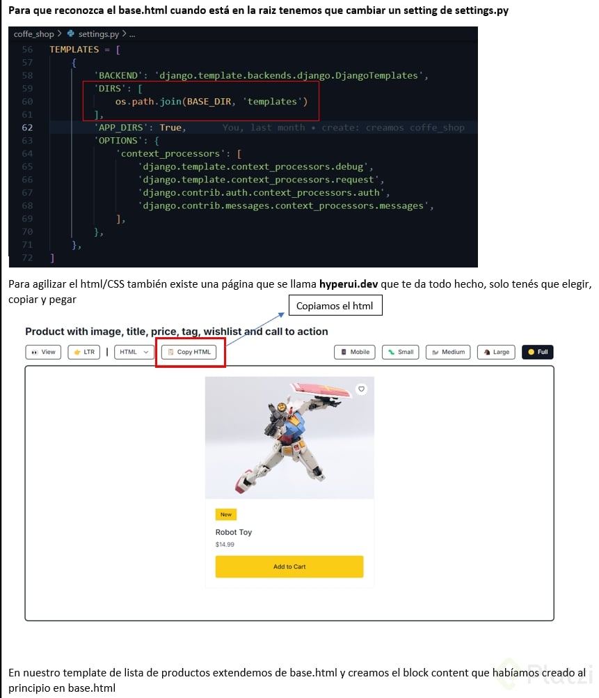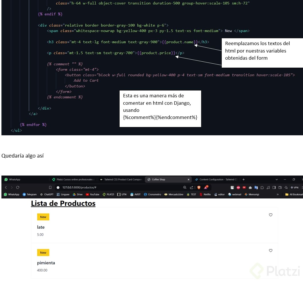 Hyper UI facilita el uso de HTML preparado para Tailwind CSS. Se copió y pegó código HTML de Hyper UI en el template de la lista de productos, adaptando nombres y precios de productos, y validando la existencia de imágenes antes de mostrarlas. Se comentó el botón de “agregar al carrito” usando tags de comentarios de Django Templates para futuras funcionalidades.