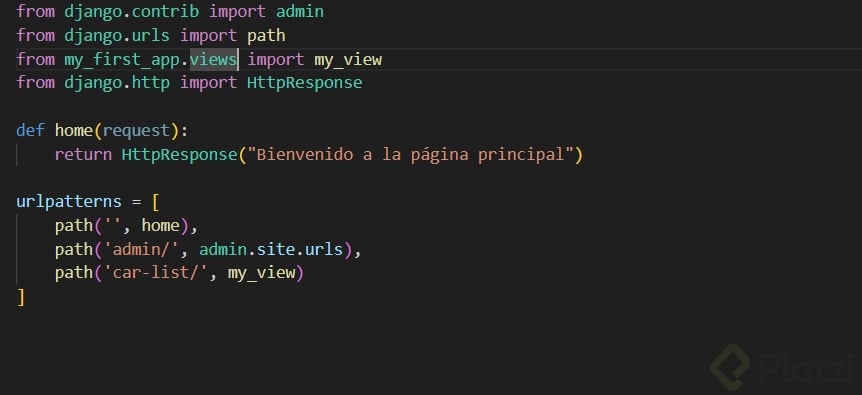 Las vistas en Django se encargan de buscar datos y devolverlos al template. Una vista se define como un método que recibe un request y retorna una response. Usaremos render para pasar el request y el template a la vista.