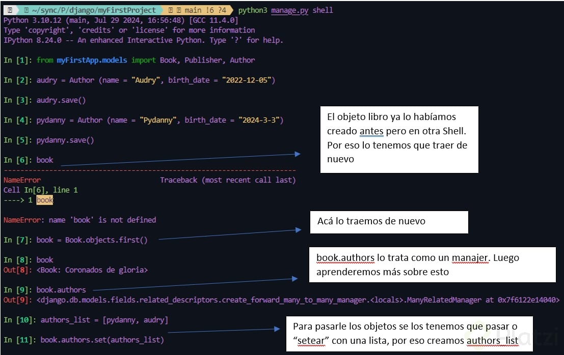 Para asociar los autores con un libro específico, utilizamos el método set() para establecer la relación en el campo many-to-many: