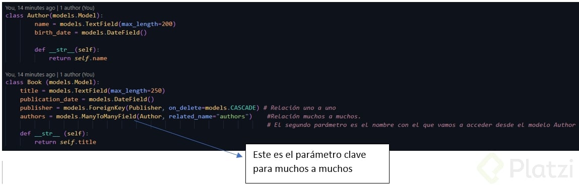 El uso de models.ManyToManyField define el tipo de relación y el parámetro related_name permite que, desde un autor, se pueda acceder a los libros que ha escrito.
