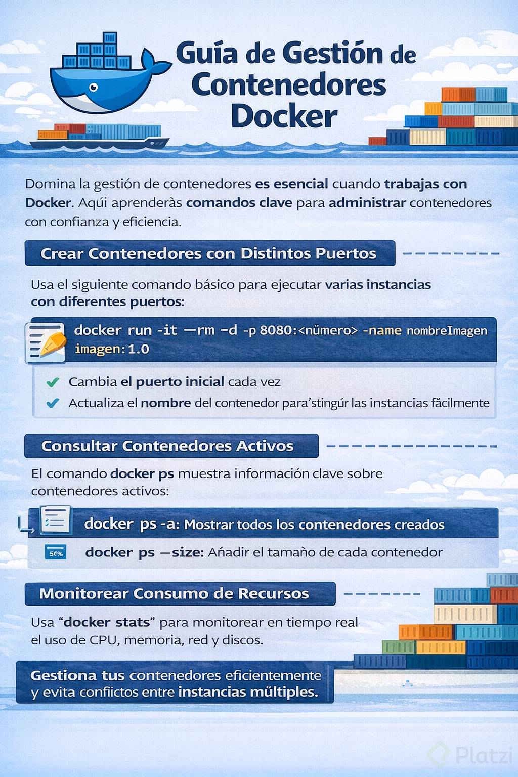 Dominar la gestión de contenedores es esencial cuando trabajas con Docker, especialmente si ejecutas múltiples instancias de una misma aplicación. Aquí aprenderás los comandos clave para administrar contenedores con confianza y eficiencia, desde su creación hasta la revisión de estadísticas en tiempo real.
