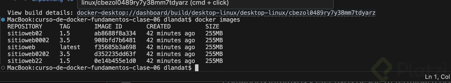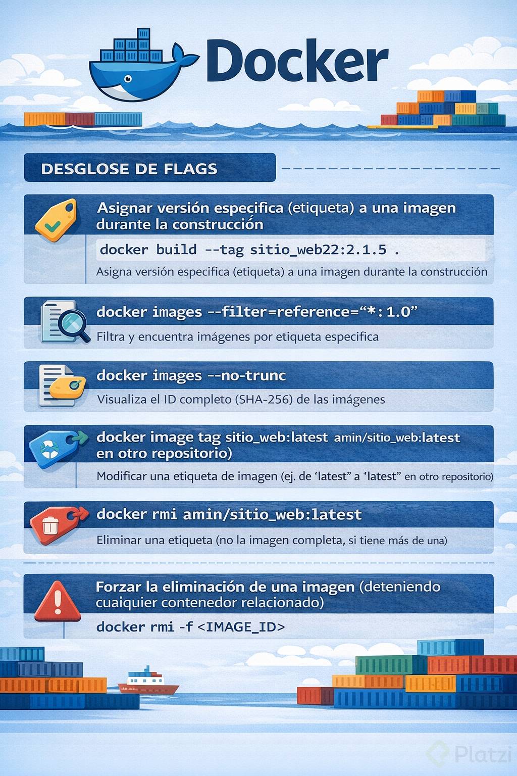 Asignar versiones específicas a tus imágenes Docker es sencillo mediante el parámetro -tag. Desde tu terminal puedes hacerlo fácilmente de esta manera:
