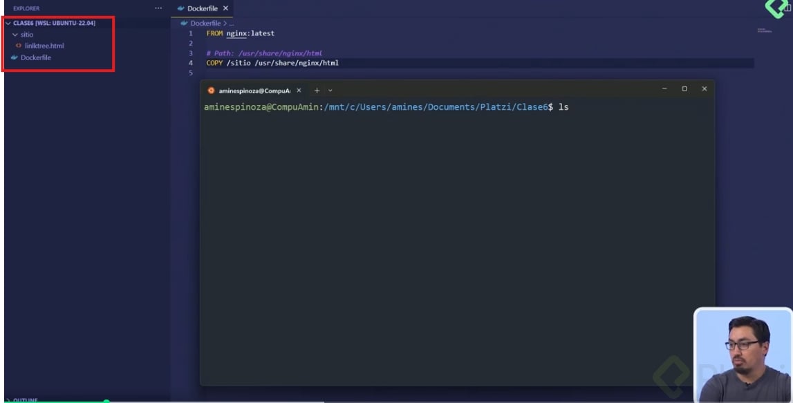 La construcción de una imagen Docker se realiza desde la línea de comandos en la misma ubicación donde se encuentra tu archivo Dockerfile. Para confirmarlo, usa el comando básico de Linux ls, que verifica que el archivo esté presente en la carpeta. Luego, ejecuta: