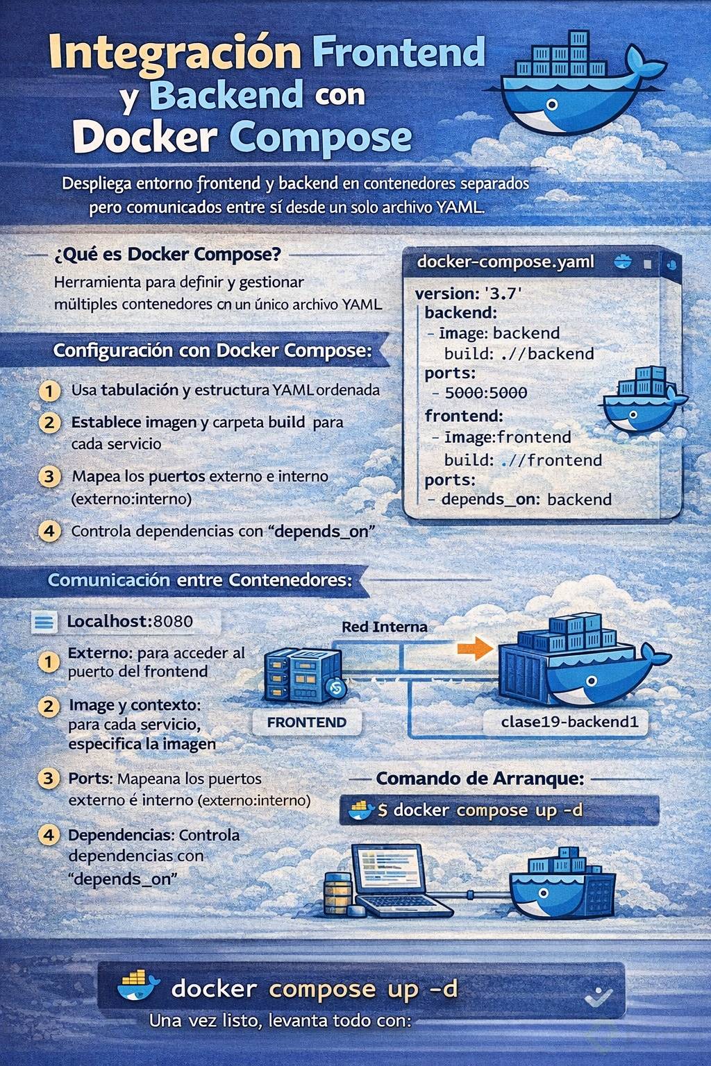 Dominar la integración de frontend y backend en un proyecto es clave para desarrollar aplicaciones robustas y eficientes. Docker Compose facilita esta tarea permitiendo desplegar ambos entornos en contenedores separados pero comunicados entre sí de manera sencilla y estructurada.