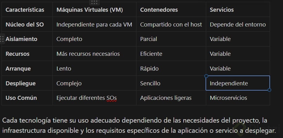 - Contenedores Docker: su aislamiento es más eficiente, pues no dependen directamente del hardware ni del sistema operativo anfitrión, funcionando independientemente sin necesidad de instalaciones adicionales.