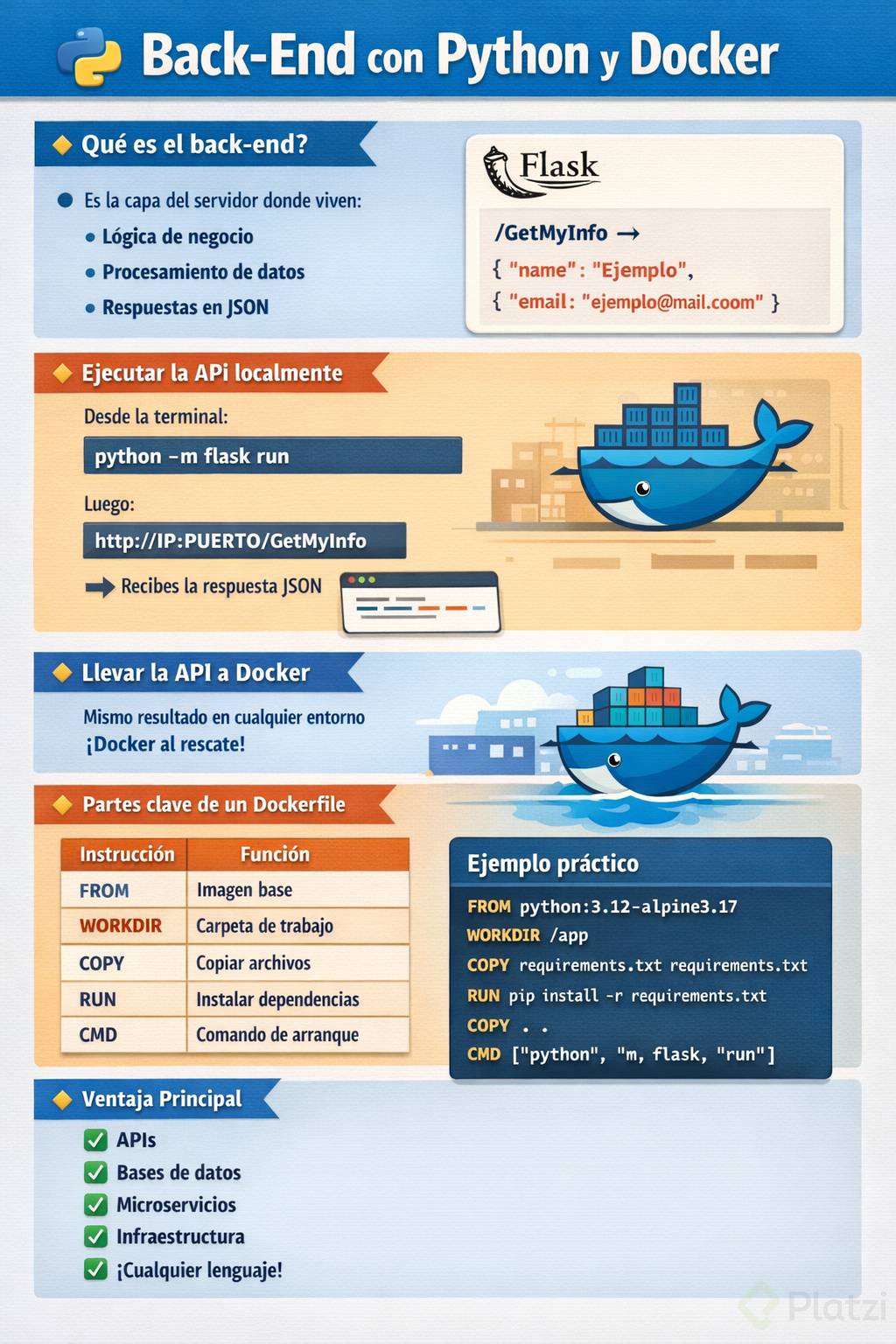 Docker utiliza términos estándar como FROM, WORKDIR, COPY, RUN y CMD, independientemente de la tecnología o plataforma que elijas trabajar. Esto significa que puedes usar estos mismos conceptos aplicados a: