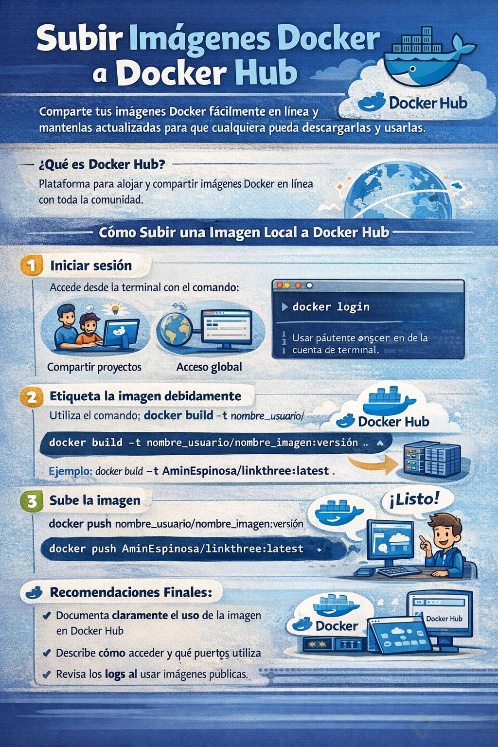 Publicar tus imágenes Docker locales en Docker Hub permite compartirlas fácilmente con personas en diferentes partes del mundo. Utilizando esta plataforma, puedes convertir tus archivos locales en recursos disponibles públicamente, muy práctico para entornos educativos, colaborativos o productivos. Aprende claramente cómo subir tus imágenes con sencillos comandos y buenas prácticas a seguir.