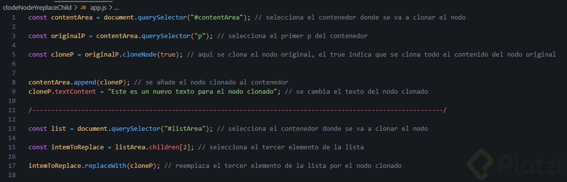 Modificar el nodo clonado: Una vez clonado e insertado, se puede modificar el contenido del nodo.