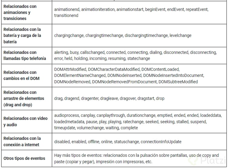 Existe una variedad de eventos en programación web. Estos pueden ser: