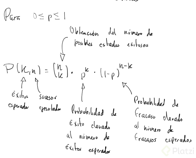- ( C(n, k) = \frac{n!}{k!(n-k)!} ) representa las combinaciones posibles de obtener ( k ) éxitos en ( n ) ensayos,