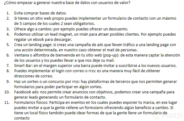 Primero debemos decir que es lo que NO debemos hacer. No debemos comprar bases de datos de correos. El motivo es que estos correos no están segmentados de una menara óptima para nuestro producto o servicio. Si nosotros realizamos las estrategias correctas, podremos obtener de manera voluntaria una gran cantidad de correos electronicos quenos permitan obtener resultados con nuestra estrategia de email marketing.