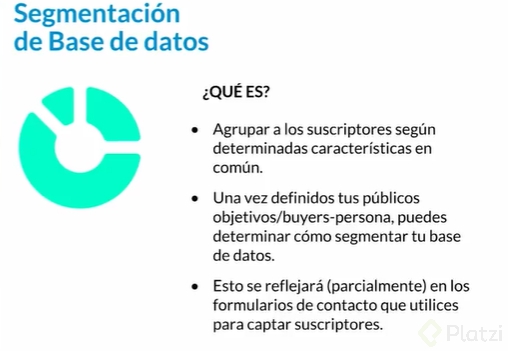 Segmentar es agrupar a los usuarios según ciertos criterios o ciertas variables, una vez definidos tus públicos objetivos/buyer-persona, puedes determinar cómo segmentar tu base de datos, esto se reflejará (parcialmente) en los formularios de contacto que utilices para captar suscriptores (según los datos que le pidas a la persona, como nombre o edad, etc.)