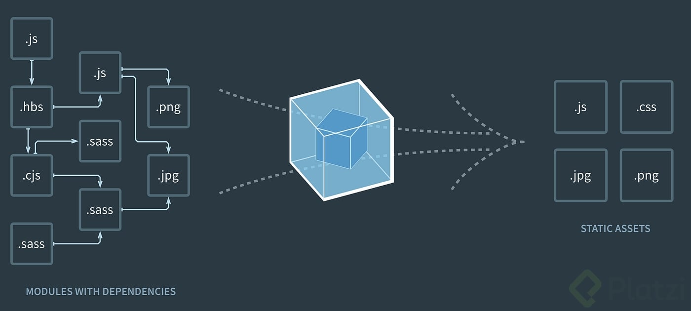 Un empaquetador analiza tu código y decide cómo manejarlo, procesando diferentes tipos de archivos y recursos, como hojas de estilo (CSS, SASS), scripts JavaScript (JS, MJS), e incluso TypeScript (TSX). Una vez configurado, un empaquetador como Webpack toma todos estos recursos y los combina en uno o más archivos optimizados.