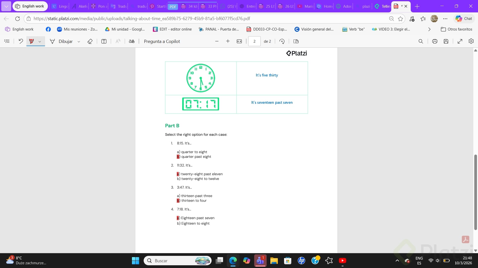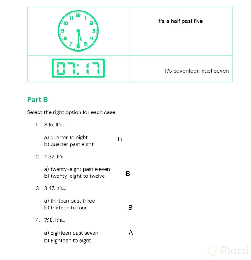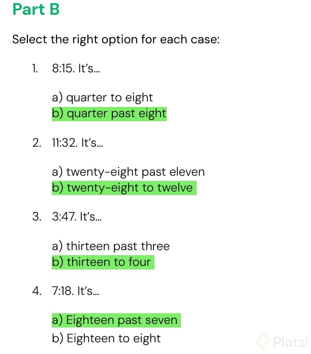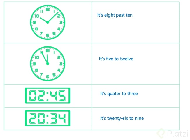 - Use quarter past for :15: “It’s quarter past 8.” (8:15).