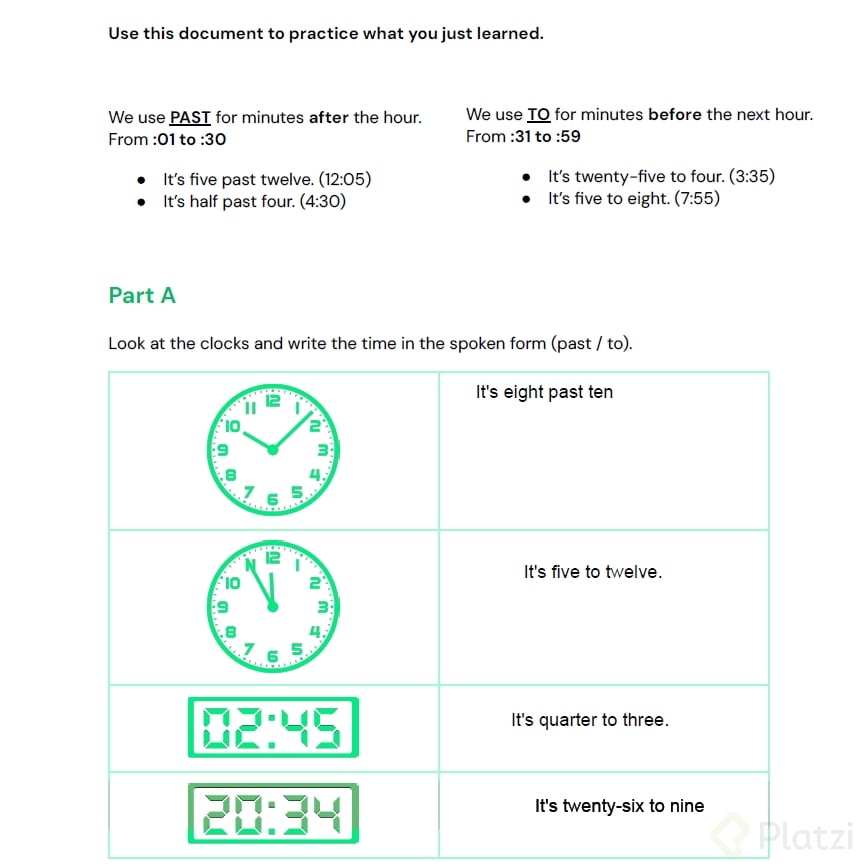 - Use half past for :30: “It’s half past 4.” (4:30).
