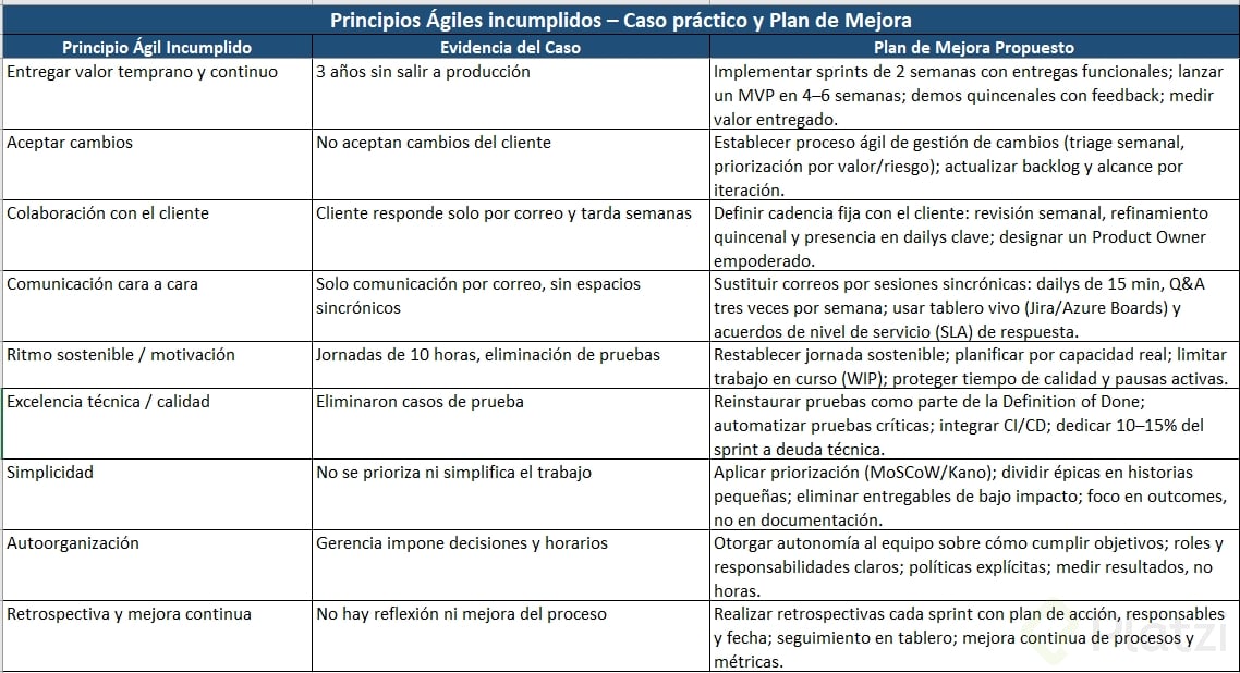 Para mejorar la agilidad, es esencial identificar qué principios no se están aplicando adecuadamente o podrían mejorarse. Al presentar estas áreas de oportunidad y proponer acciones concretas para implementar los principios ágiles, se puede contribuir a aumentar la agilidad del equipo.