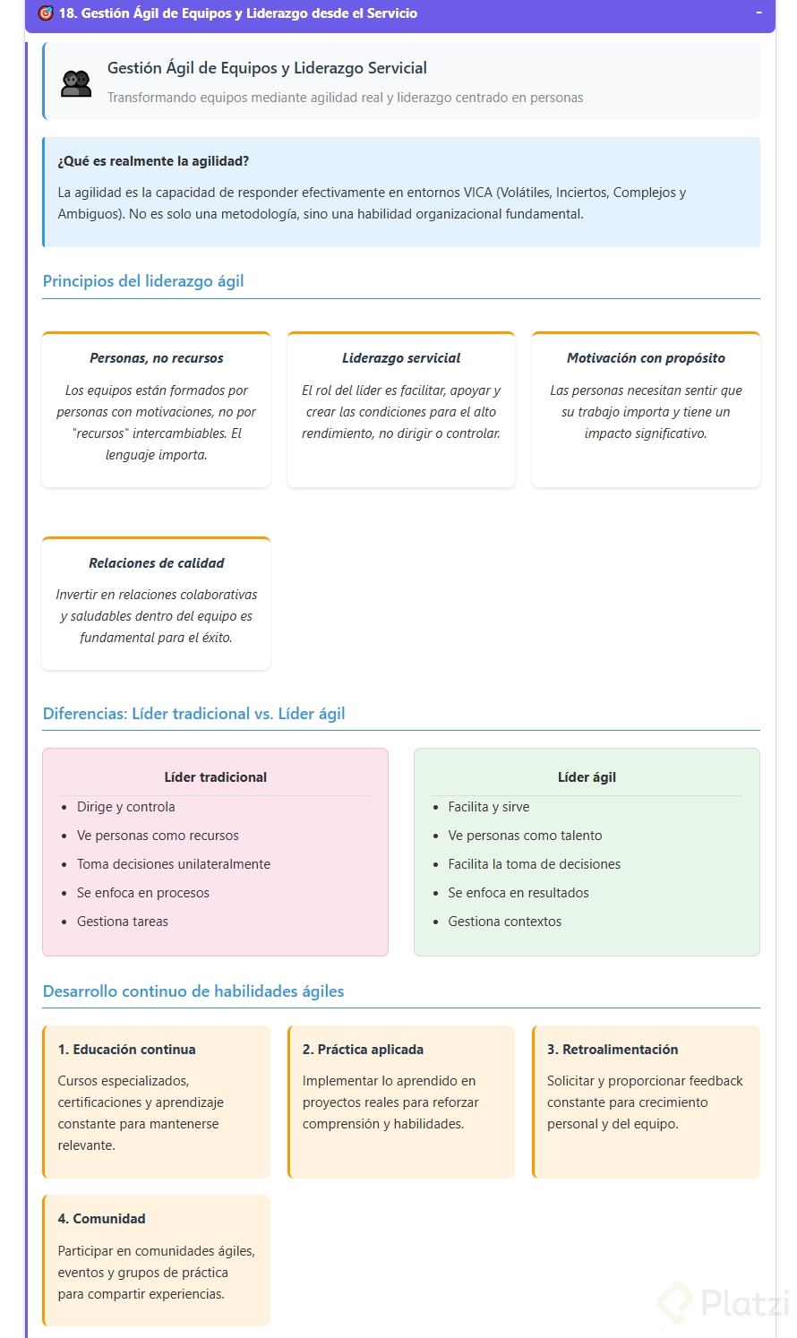 - Liderazgo desde el servicio: En un equipo ágil, un líder no es un mando estricto; su papel es facilitar, apoyar y maximizar las condiciones para el alto rendimiento del equipo.