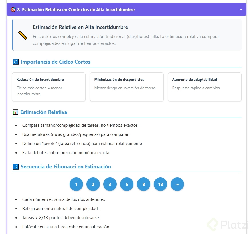 - Buenas prácticas: Para ciclos o iteraciones, es recomendable que las tareas estimadas no excedan valores como 8 o 13. Si una tarea sobrepasa estos números, debería desglosarse en partes menores.