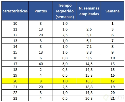 - ¿Cuál será la fecha de finalización para, por ejemplo, la característica número 20, basándose en la velocidad actual del equipo?