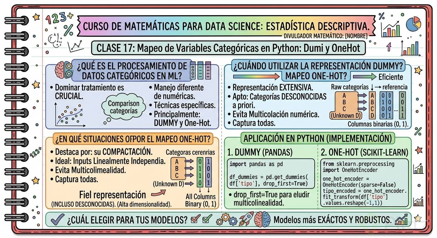 Cuando trabajas con modelos de machine learning, no basta con saber procesar datos numéricos. Las variables categóricas —como el tipo de motor de un auto o la especie de una flor— requieren un tratamiento completamente distinto para que los algoritmos puedan interpretarlas correctamente. Aquí se explican los dos métodos principales para convertir categorías de texto en atributos numéricos: la representación dummy y la representación one hot.