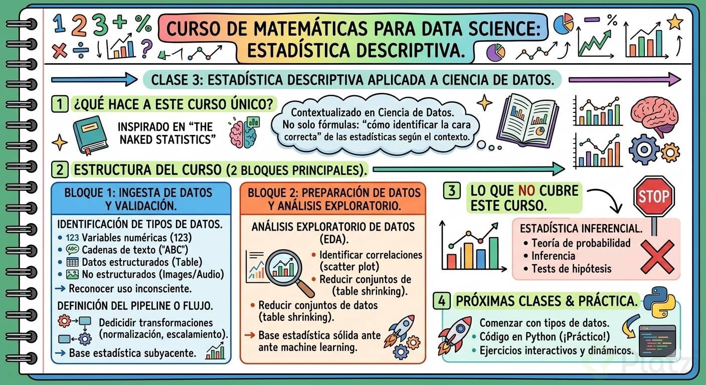 Este curso se centra en la estadística descriptiva aplicada a ciencia de datos y no cubrirá temas de estadística inferencial, como teoría de probabilidad, inferencia o tests de hipótesis, los cuales forman parte de la estadística inferencial.